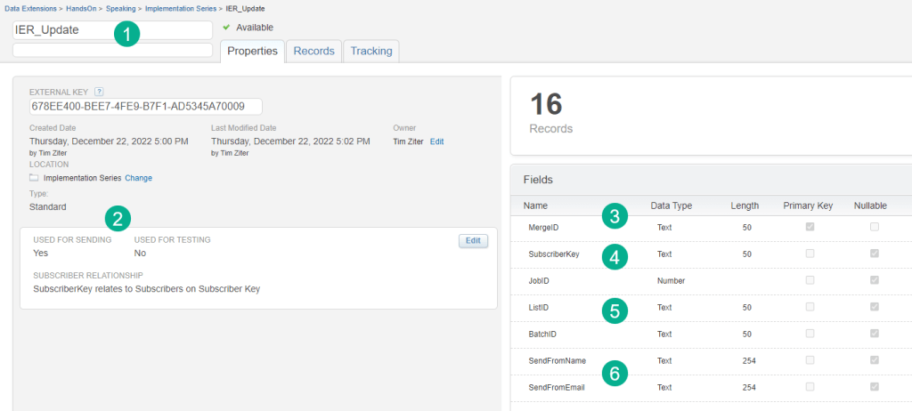 First up you’ll want to create a Data Extension that will include the key data points needed to update the IER records via the Journey.