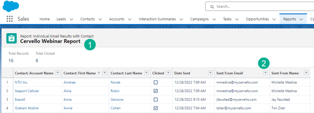 When they run a report on those Distributed Marketing sends they can see the basic engagement stats like sends, opens and clicks, but they can’t see who sent the emails to determine which sales people needed to be reminded to send more emails.