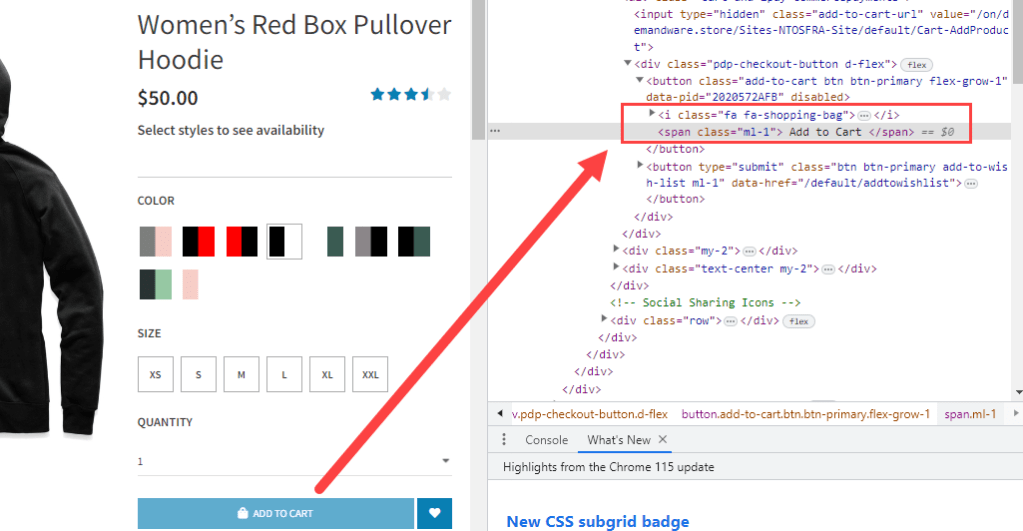 Sandesh points out that if you inspect the product detail page on the Add To Cart button you’ll see in the CSS the class “Add to Cart”.