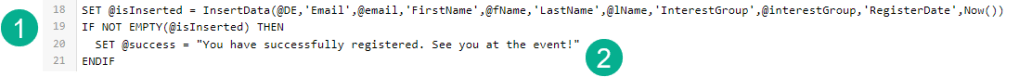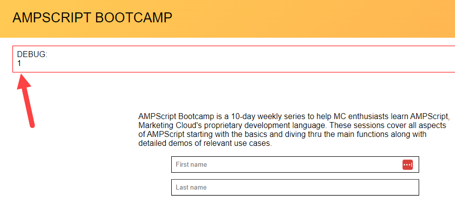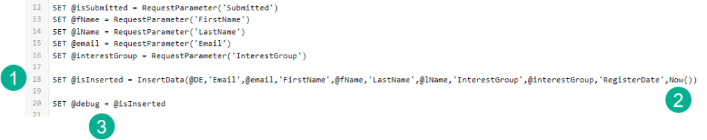 3.) Last, to help we’re going to set our Debug variable to the @isInserted variable which if the InsertData is successful should return a value of “1”. For more on the Debug syntax please click here: https://handsonsfmc.com/ampscript-bootcamp-part-ii-debug/
