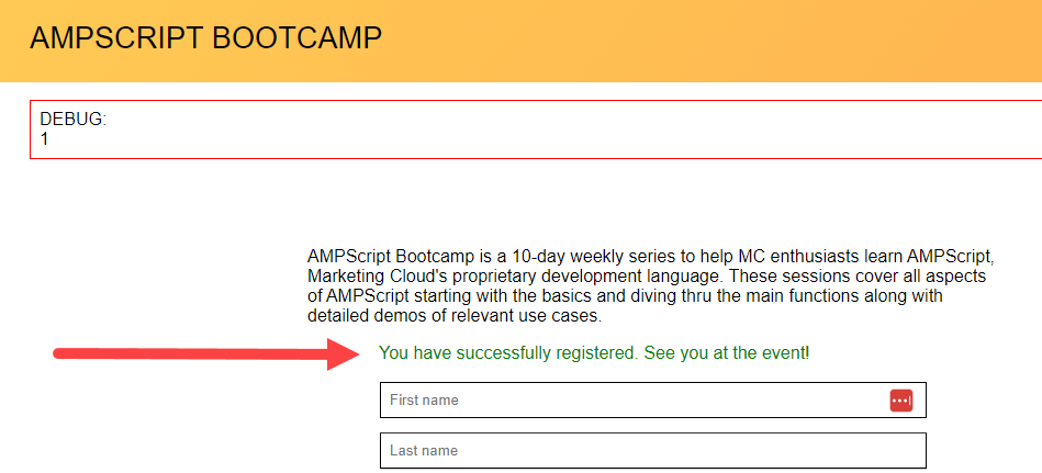 Now when you fill out and enter the form and it successfully adds to the data extension a message appears on the form: