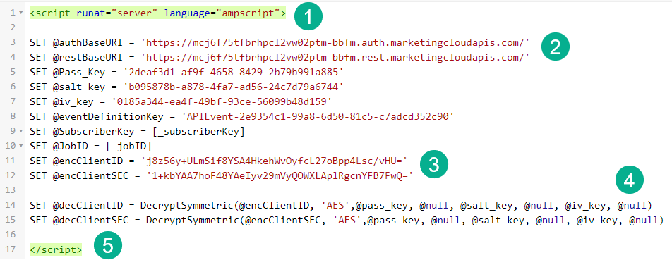 (4) Use the Decrypt function to set a variable for the unencrypted Client ID and Secret. Use the Ampscript guide for more information: https://ampscript.guide/decryptsymmetric/