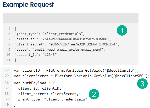 (3) Copy in the Client ID and Client Secret from the Installed Package and fill out the payload per the documentation: