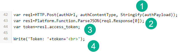 (2) Now you need to set a variable based on the response that comes from the call. To do this use the plaform function ParseJSON: https://developer.salesforce.com/docs/marketing/marketing-cloud/guide/ssjs_platformUtilityParseJSON.html of the req1 variable that was created by the HTTP function above. In the syntax you are looking to obtain the first variable in the Response string using the [0] syntax. Here’s an example of the response highlighted in the developer documentation:
