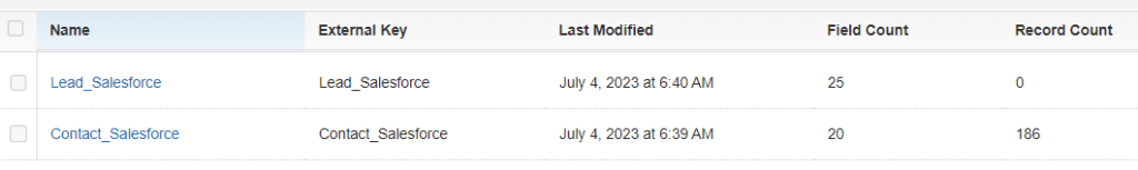 We have zero synched Leads and only 186 synched Contacts. These counts are found by navigating to the synchronized data extension folder in Contact Builder.