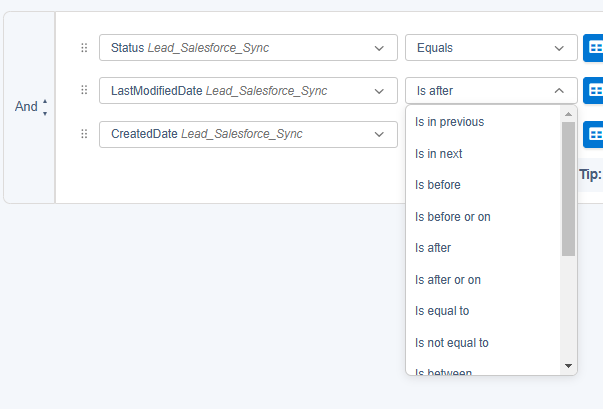 (2) To make the WHERE section super easy, simply drag and drop any field from any of the data extensions set in the FROM section. Take a look at the options available for each filter value: